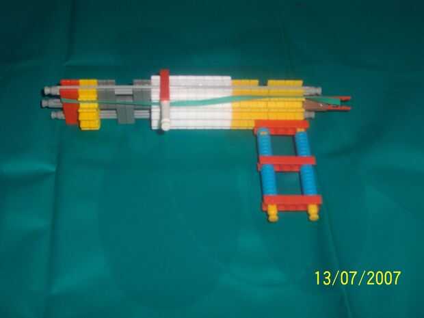 conectar todas las piezas que hiciste de hecho como se muestra en la imagen. También conectar la goma el conector naranja en el extremo del perno de la leña y el otro extremo a la parte delantera de la pistola. Esto es un disparador de bloque así que tire hacia atrás el percutor la vuelta el gatillo por lo que cubre el agujero que la leña viene de. Vuelva a colocar la munición en el frente de la pistola. Ahora estás listo para disparar.