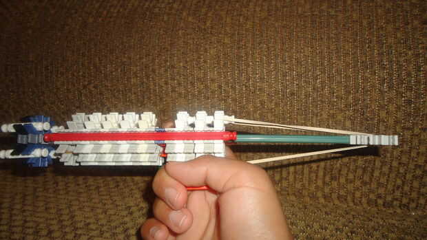 24 requiere KVG piezas, dos pequeñas bandas de goma y algunas pequeñas bandas de goma para munición (trabajo de bandas de refuerzo).Paso 1: El mango Paso 2: Cañón y disparo Paso 3: Mecanismo de carga Paso 4: Juntándolo todo Puede que tengas problemas