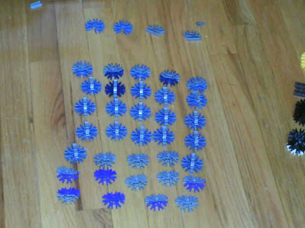 Tomar todos sino dos de los conectores azules y conectar con los conectadores grises. Todavía debe haber algunos conectores gris sobrados. Conecte todo pero dos de ellos entre sí.