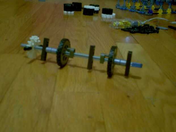 Hacer aquí el eje de las ruedas principales. Asegúrese de añadir las pequeñas barras de negro en el conector blanco. También puede ver las cosas mustardish marrón que estaba hablando y la cosa azul que parece una cosa mustardish marrón en el extremo.