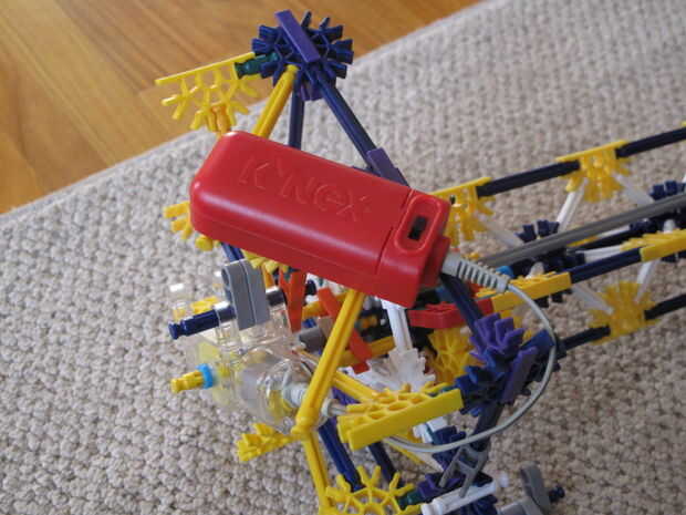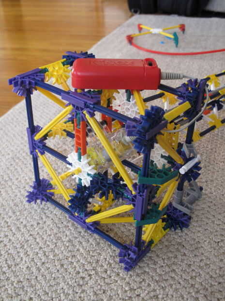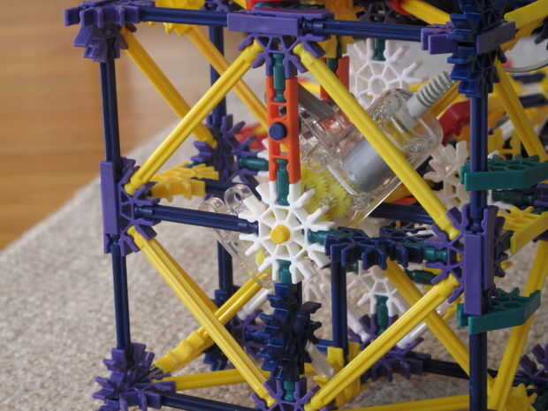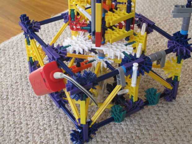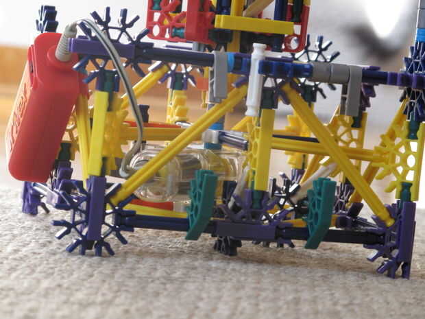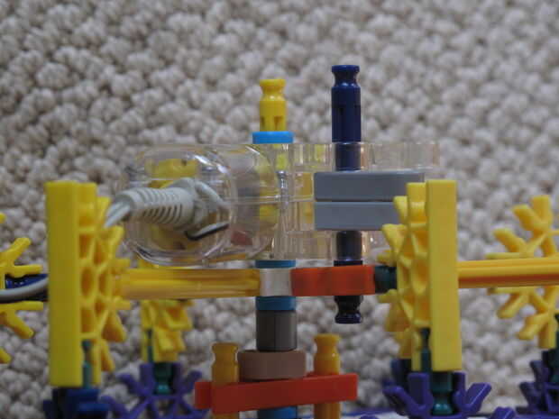 PIC. 4 - agregar el motor a la barra amarilla de la torre media. Debe haber un separador azul a cada lado del motor. La barra azul debe deslizarse en el conector naranja, como se muestra en la imagen.