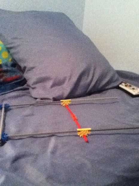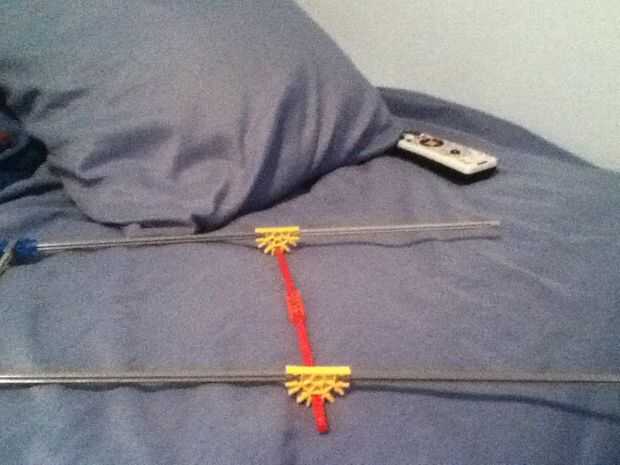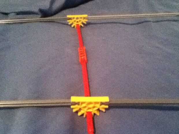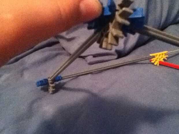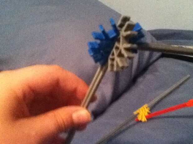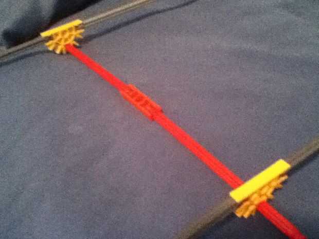 utiliza k'nex todos excepto el perno usado para conectar la cámara a la k'nex. Vean mi video de youtube sobre cómo hacerlo y usarlo.Paso 1: Construir la Base Conecte 2 conectores azules o negros con una barra blanca y añadir 2 conectores de media lun
