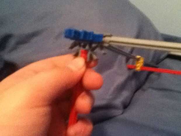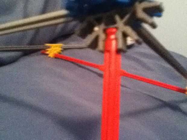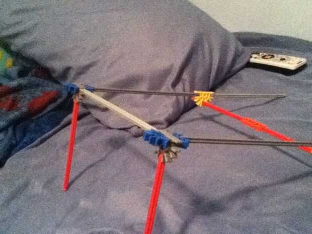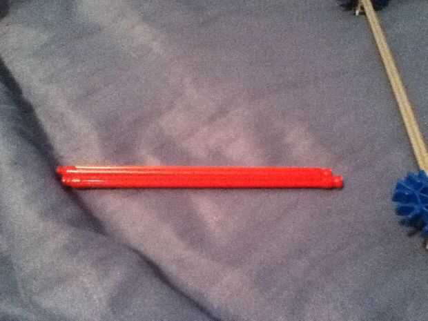 utiliza k'nex todos excepto el perno usado para conectar la cámara a la k'nex. Vean mi video de youtube sobre cómo hacerlo y usarlo.Paso 1: Construir la Base Conecte 2 conectores azules o negros con una barra blanca y añadir 2 conectores de media lun