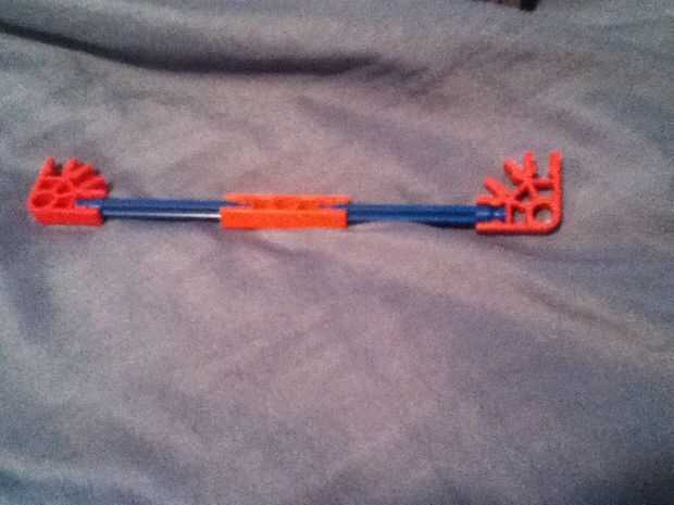 utiliza k'nex todos excepto el perno usado para conectar la cámara a la k'nex. Vean mi video de youtube sobre cómo hacerlo y usarlo.Paso 1: Construir la Base Conecte 2 conectores azules o negros con una barra blanca y añadir 2 conectores de media lun