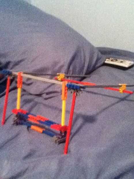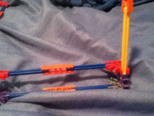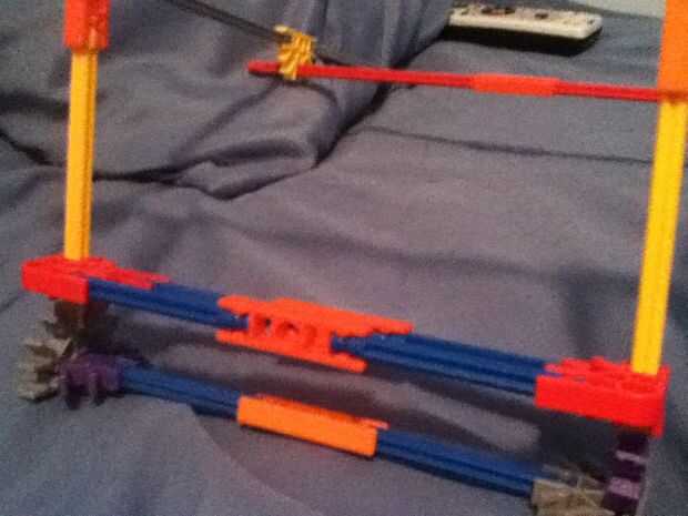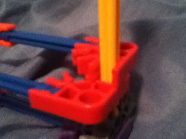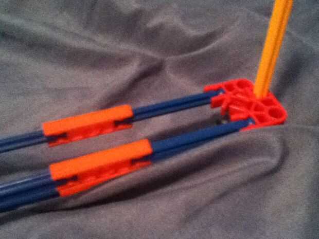 utiliza k'nex todos excepto el perno usado para conectar la cámara a la k'nex. Vean mi video de youtube sobre cómo hacerlo y usarlo.Paso 1: Construir la Base Conecte 2 conectores azules o negros con una barra blanca y añadir 2 conectores de media lun