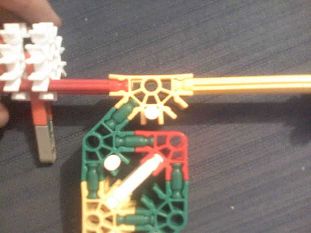 construir los dos lados de la empuñadura, deben ser idénticos a unos de otros, de la segunda foto, que es auto explicativo. en cada barra blanca horizontal, coloque un conector verde entre las piezas y conectar a la barra así, esto funciona como separador y mantiene el mango de una anchura constante