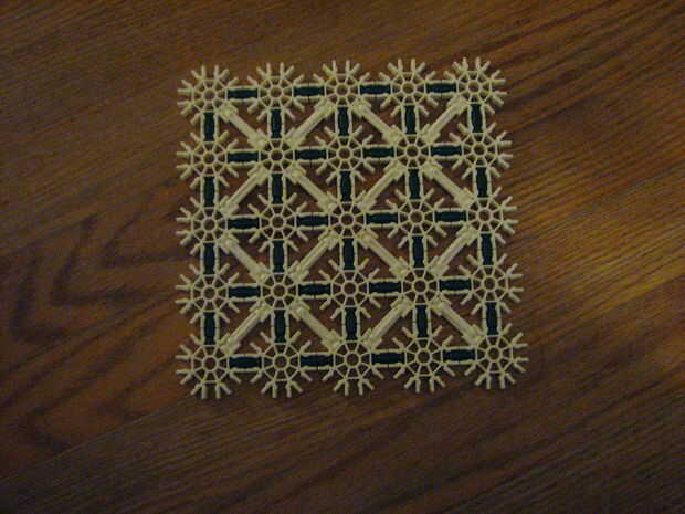 Para construir los copos de nieve de la tapa de tabla, se utiliza el blanco, todas las barras blancas, todas pequeñas cañas de verde/negro, algunos amarillo medio todas esquinas rojo, extremos gris 4 y 8 púrpura clip de 3-d piezas. Para el centro, necesita los copos de nieve, barras de blanco y las barras pequeñas. Conectará los copos de nieve en un cuadrado de 5 x 5 y conectará los copos de nieve con las varillas verdes. Luego, le pones las barras blancas entre los copos de nieve diagonalmente. Su centro está hecho!