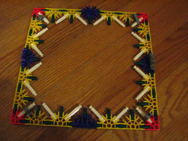 Para el marco, utilice el resto de las barras blancas para el paso 2, las esquinas rojo, el amarillo semicírculos, las barras pequeñas, los 4 conectores gris, los semicírculos 3d y prepárate construir. Primero conectar el 3d juntos. Luego colocar el marco, poniendo una esquina, 2 conectores amarillo, bloque 3d, 2 conectores amarillos, luego la esquina roja y rellenar donde conectan con pequeñas barras. Se hace un lado. repetir y hacer todos los lados iguales. Después pequeñas barras verdes hacia afuera apuntando a los centros y palo blanco barras diagonales al conector.