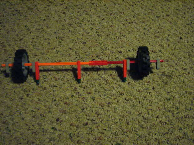 Esto es solo si quieres las ruedas en la parte inferior. Sean desmontables. Usar extremos gris 12 12 conectores naranja, 9 varillas pequeñas, 6 ruedas, 3 barras rojo y 3 varillas largas. 7,5 pulgadas de largo o 19,1 centímetros. Siga las imágenes.