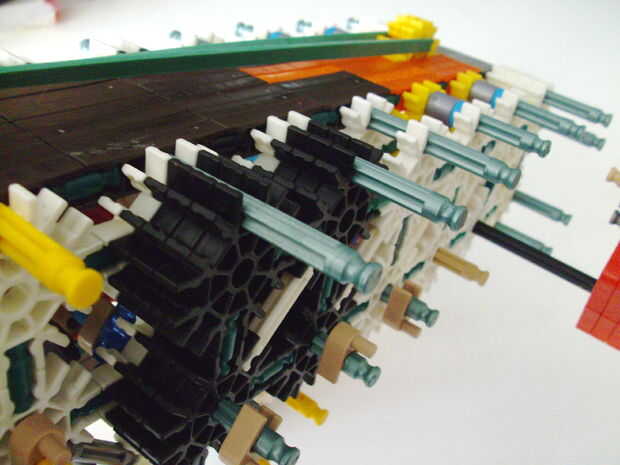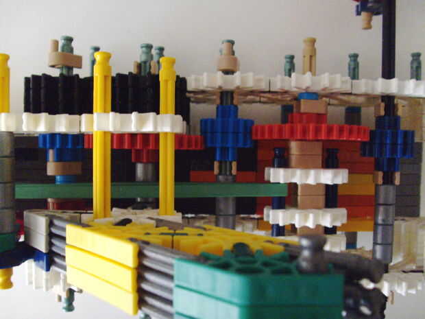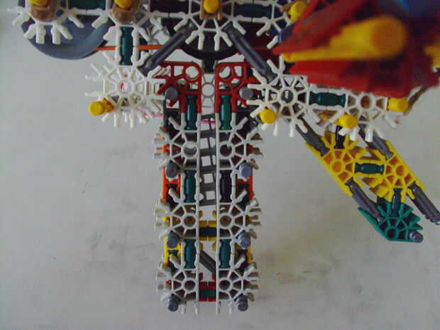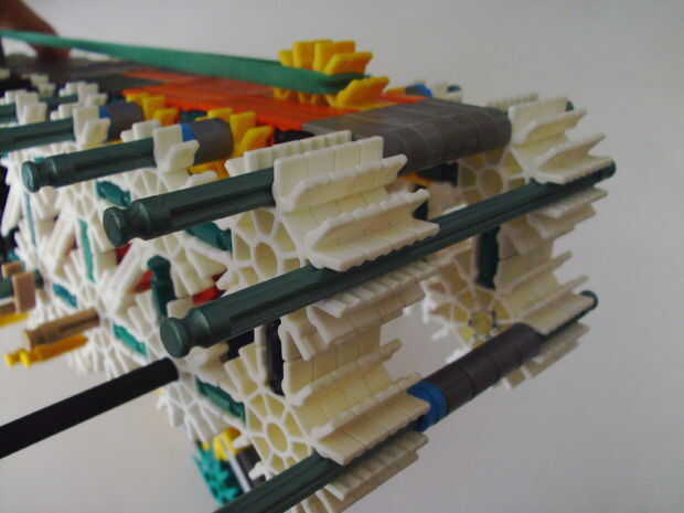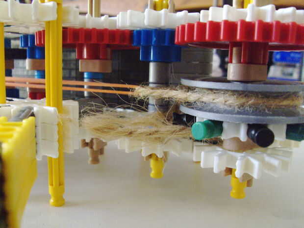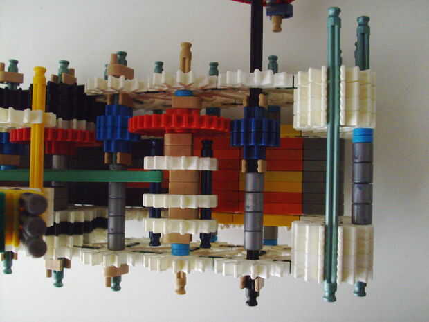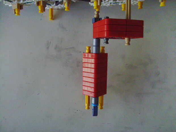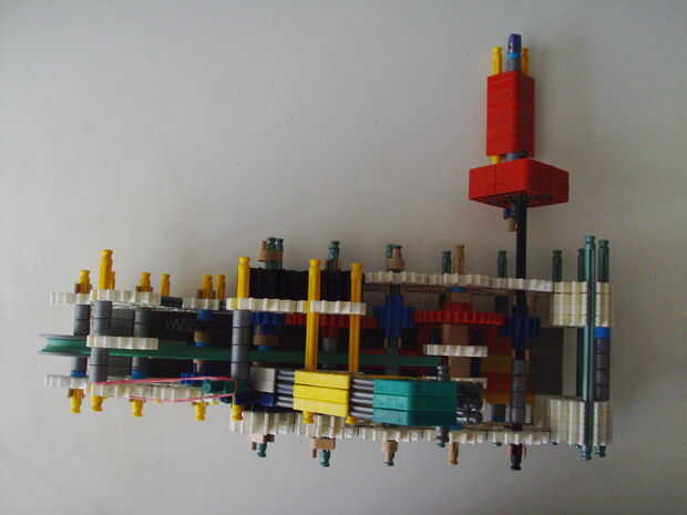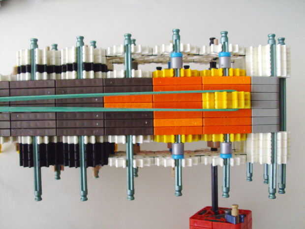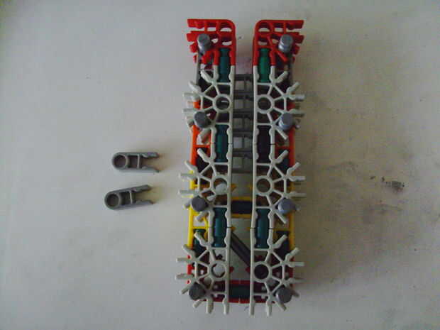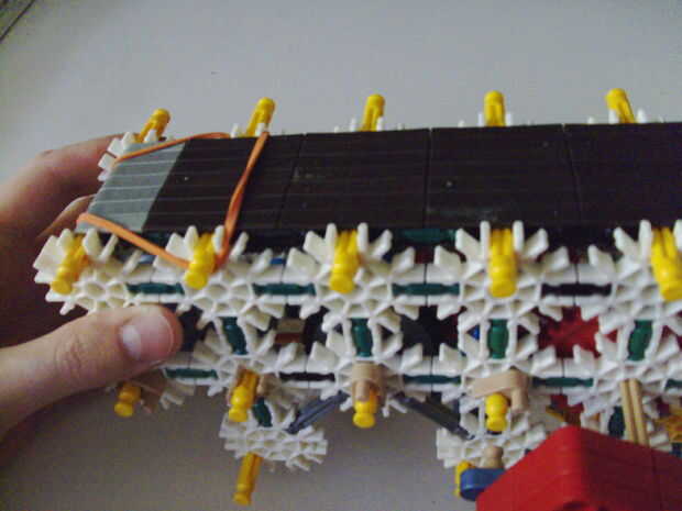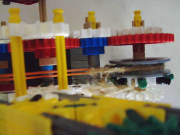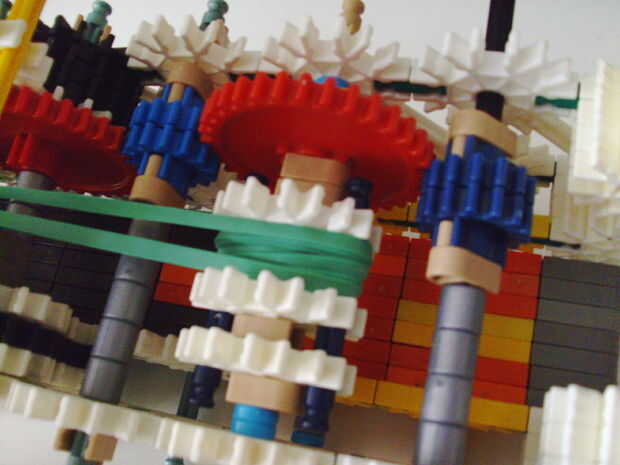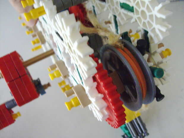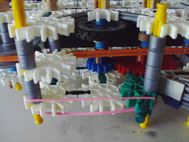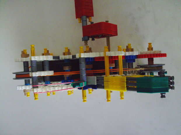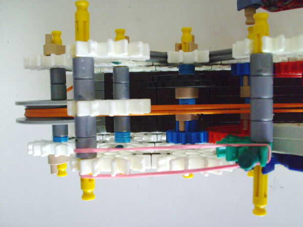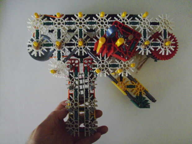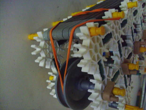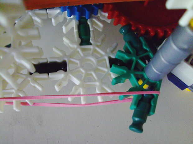 Esta pistola funciona con elástico atado con cadena a una rueda, que a su vez está conectada (por la misma cadena) a un conector blanco que actúa como un ancla y carretes el elástico alrededor de la rueda. Cuando se suelta el gatillo gira una serie de engranajes que están configurados para multiplicar la velocidad de los engranajes de giro en la parte delantera de la pistola (6 veces más rápida en la primera fila de la fila de atrás). Dispara conectores gris de una revista por que circula entre en contacto con una rueca recauchutada. La fricción de elásticos empujando hacia arriba los asaltos contra los peldaños de caucho proporciona suficiente fricción para expulsar los conectores a la velocidad. En la actualidad, sin embargo, tiene 1 pie de gama. Esto es debido a: mucha energía se pierde haciendo girar la manivela cuando dispara, y b: el conector tan que sostiene el engranaje en lugar de la varilla con la manivela unida aparece fuera de él allí es demasiada presión, por lo que no puedo aumentar la tensión del elástico. He probado esto sin la manivela y consiguió cerca de 4 pies de rango. Si pueden superar las limitaciones de la manivela y tensión 20 pies de gama parece alcanzable. No molesta en poner un montón de trabajo de la forma en que el mag se fija a la pistola porque decidí abondonar esta versión.