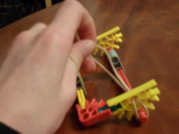 Entonces la goma va por el agujero, ganchos en la barra roja.