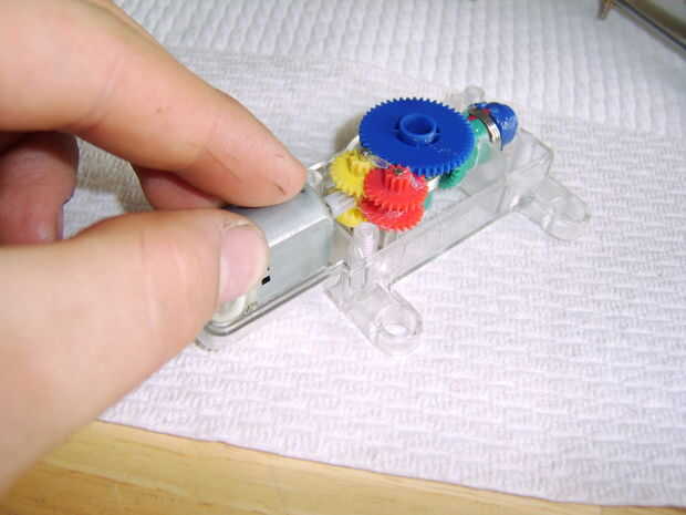-Cuidadosamente empuje el motor en el acoplamiento de los engranajes de reducción. El motor sólo va en un sentido, su ensayo y error!