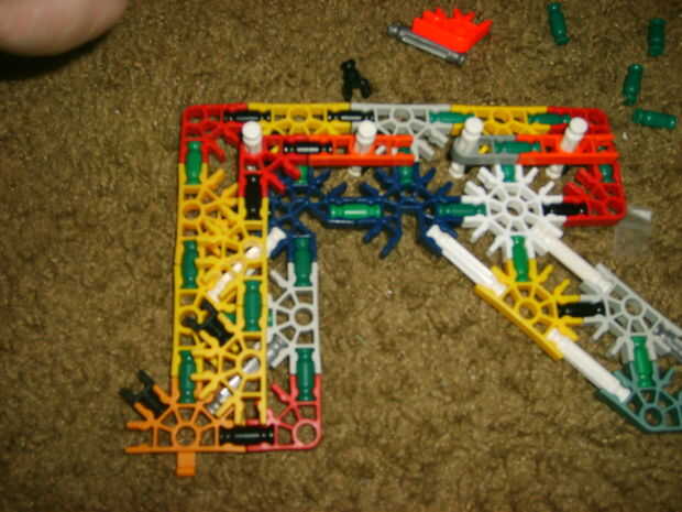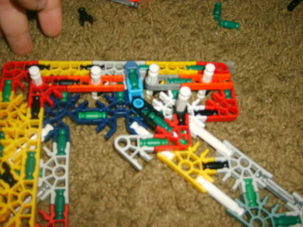 es un arma de simple KVG con desencadenar nuevos lo siento por pequeñas fotos usé mi teléfonoPaso 1: barril acaba de poner conectores rojo 11 en una barra rojaPaso 2: gatillo hacer este 2 conectores naranja sobre una barra blancaPaso 3: manejar! sin