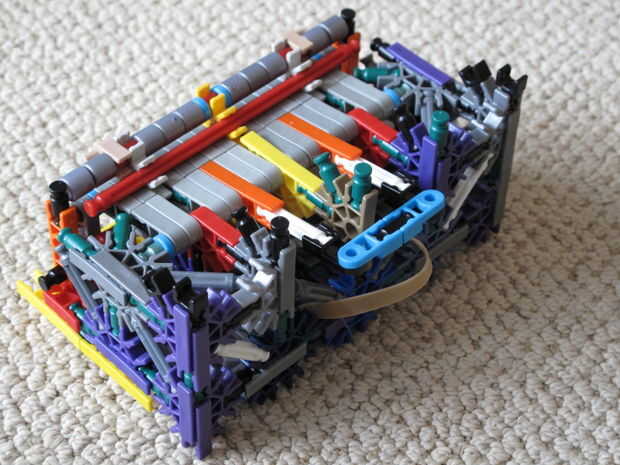 Ahora te combinas la base y el golpeador. Asegúrese de que todo esté alineado. No coloque la banda elástica en las bisagras aún. Puede ser difícil de fijar algunas piezas en el interior, pero sólo tendrás que conseguir sus dedos allí y EM en snap. Y asegúrese de que las dos barras afiladas en los agujeros del conector.