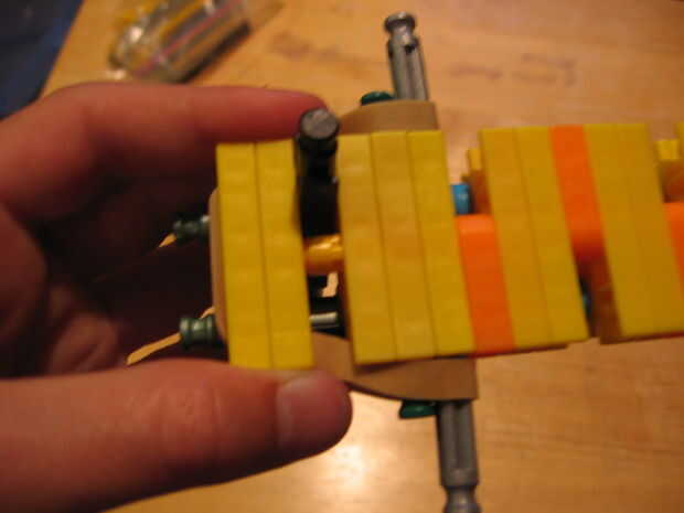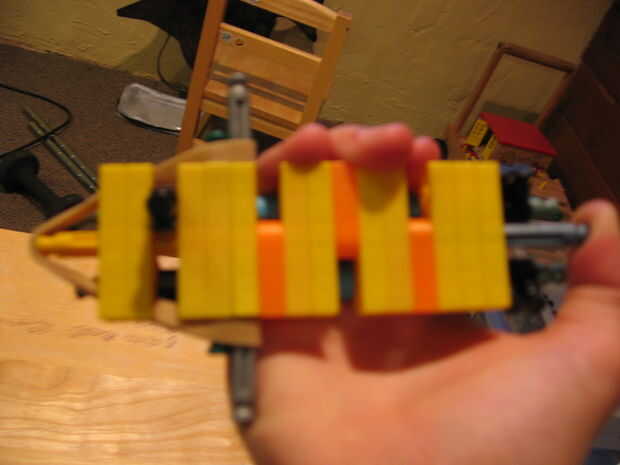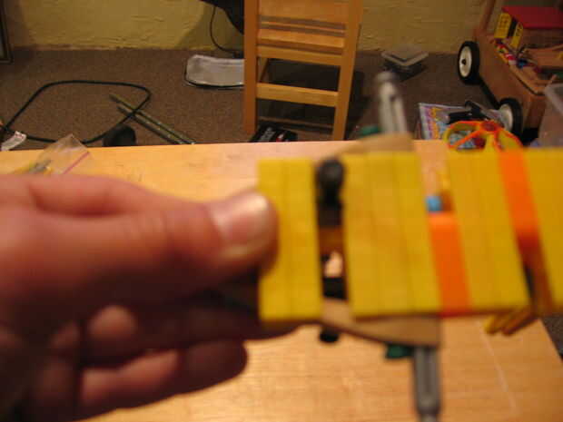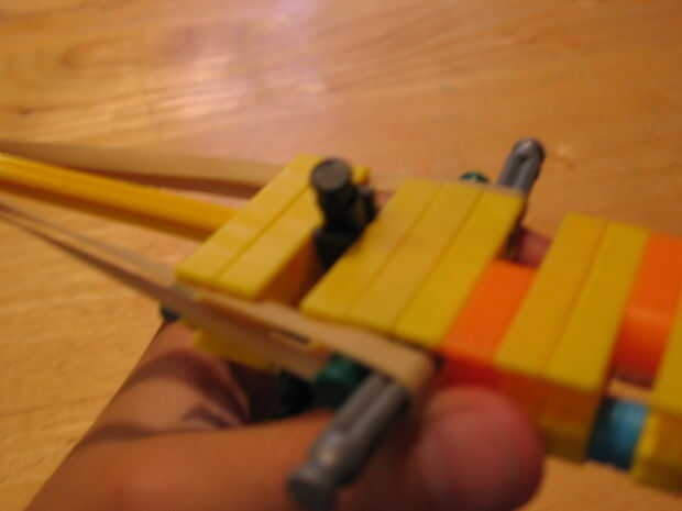 Esto es un poco complicado y puede parecer mucho a un arma de estilo de los años 1800, pero usted conseguirá la caída de la misma. Primero usted empujar una barra amarilla en el cañón. La utilizas la barra azul en el gatillo para empujarlo fuera de la parte posterior de la pistola. Agarra la barra amarilla y vuelva a colocar la barra azul al gatillo. Tire de la barra amarilla y asegúrese de que las cerraduras del disparador. Tire del gatillo para disparar la barra azul. Las imágenes pueden dar más detalles.