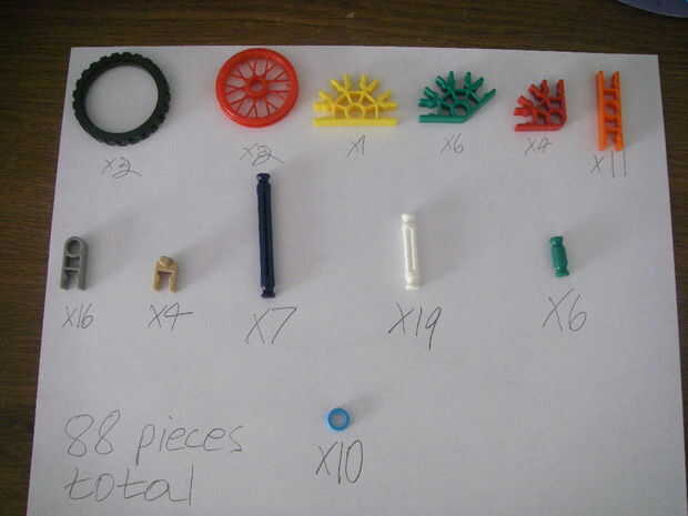 una moto, tiene un soporte y es bastante pequeña.Paso 1: Lista de piezasBarras deVerde - 3Blanco - 8Azul - 6ConectoresGris 1 slot - 2Naranja - 4Rojo - 3Verde - 2Amarillo - 3Azul 3D - 2VariosEspaciadores de azul - 5Espaciadores de gris - 1Ruedas de ta