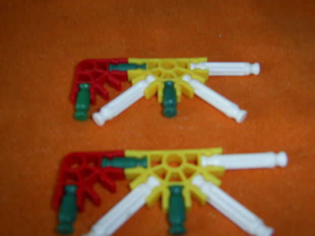 este cuchillo KVG es muy fácil de hacer y es bastante fuerte. Necesita: 10 conectores azules, 1 conector blanco oscuro, 1 conector verde, 3 conectores amarillo, 2 conectores naranja, 2 barras amarillas, 2 barras blancas, 3 barras verdes, 1 barra roja