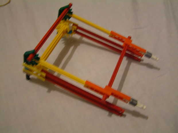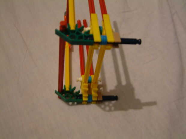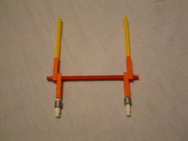 2. clip 4 conectores naranja a un rojo varilla como en la imagen, luego añadir 2 barras amarillas a 2 de los los conectores y luego a barras de blanco con un gris espaciadores a los otros 2.