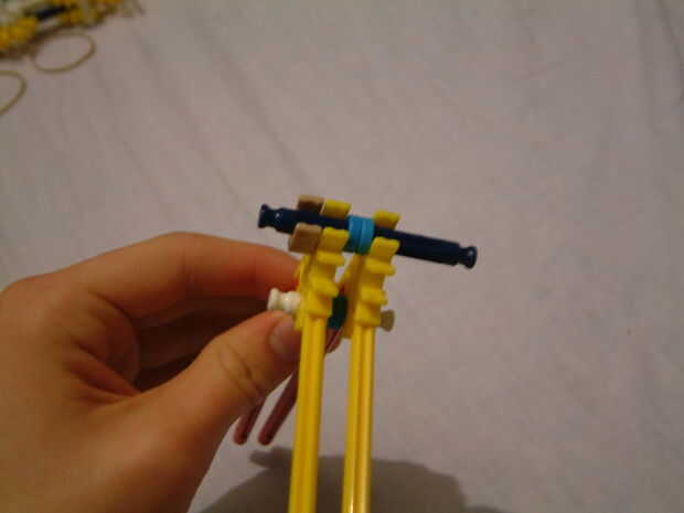 3 y 4. Clip un conector tan y 2 espaciadores azul en una barra azul y conecte con el resto del mango.
