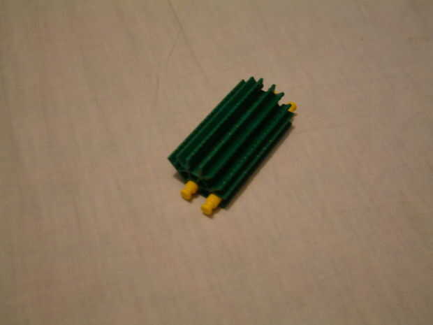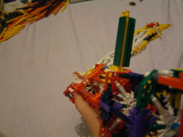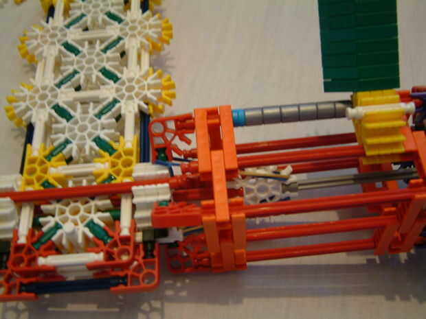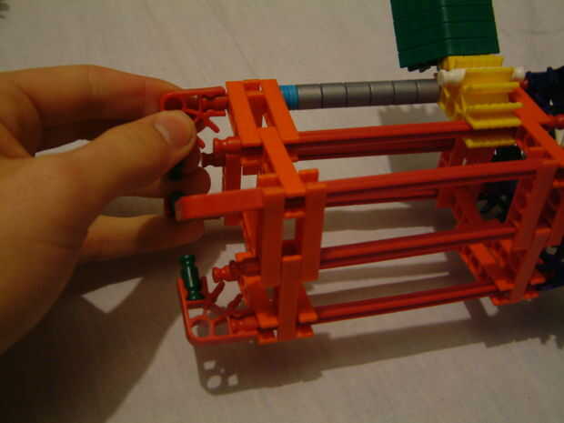 una vez haya hecho el mango, clip 3 conectores amarillo a una barra blanca y ponen en las barras del rojo como en las fotos abajo. una vez que esté en usted deslizan a algunos espaciadores por demasiado para mantenerlo en su lugar.