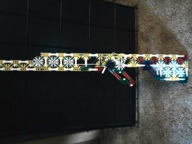 pepinos Hola a todos compañeros Knexers y los recién llegados. mi nuevo disparo, rifle de largo alcance KVG, con alcance real, bípode plegable, verdadero gatillo, cualquier shooter munición, 1,20 m de altura, 110 pies gama con oodammo (conector rojo