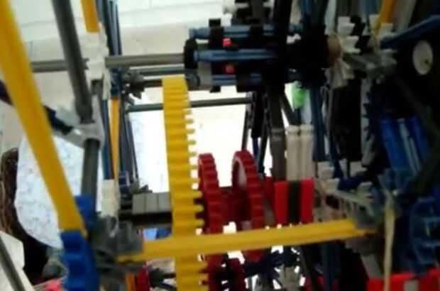 Para empezar, el reloj es accionado por el movimiento hacia abajo de la botella de agua. Se tira de la cadena que está conectada con los engranajes en la parte posterior del reloj. Estos engranajes están en el mismo eje como el que regula la velocidad del reloj de péndulo. Como el eje gira, el movimiento va en una caja de engranajes que controla la aguja de los minutos. Se asegura que el minutero toma aproximadamente 60 minutos para hacerlo todo el día. Después de una rotación completa, otra rueda dentada (imágenes 4 y 5) vuelve un poco que se encuentra en el mismo eje como la manecilla de los minutos pero se mueve independientemente. Cuando da vuelta, la mano se mueve la longitud correcta de la muestra a última hora.
