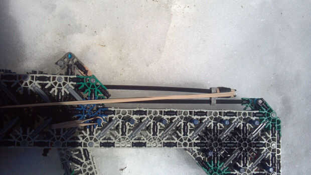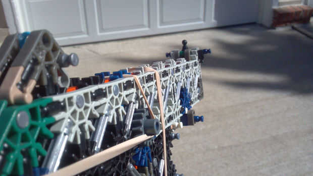 Utilizando dos #64 las bandas se consigue alrededor de 50 pies. Las bandas no se estiran mucho, y yo puedo Hale el pasador de vuelta con mi mano izquierda... fácilmente. (Yo soy diestro.)