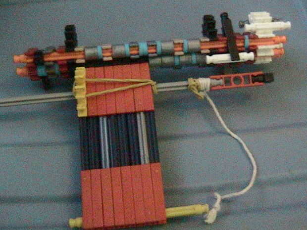 bueno, aquí está. Mi azul barra de tiro, 7 disparos de pistola semiautomática k'nex.Es no más o menos de gran alcance y armas más el automáticos y es muy confiable (a veces falla, pero nunca jams).No es un semi-auto perfecto, porque no puede mantener