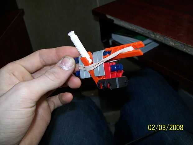 es un arma de simple KVG con desencadenar nuevos lo siento por pequeñas fotos usé mi teléfonoPaso 1: barril acaba de poner conectores rojo 11 en una barra rojaPaso 2: gatillo hacer este 2 conectores naranja sobre una barra blancaPaso 3: manejar! sin