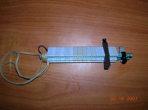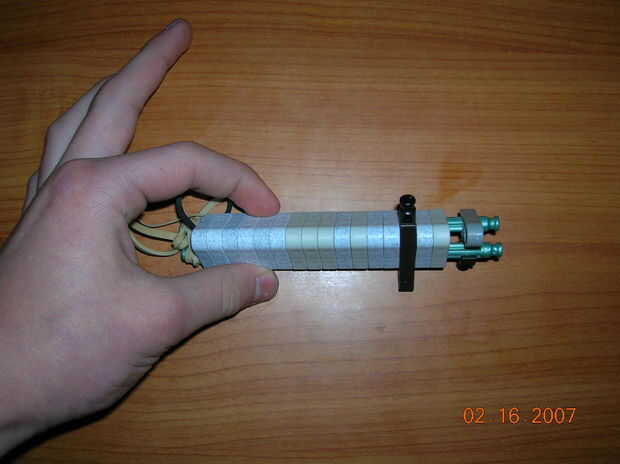 este es mi primer arma de KVG :)Es una pistola pequeña(Estadísticas):Cómoda manijaverdadero gatillo (de Córcega)5 redondos compartimientopequeñobarras de brotes verdesrango: 25-30 pies (con más goma bandas podrían tirar más lejos)Permite así obtener