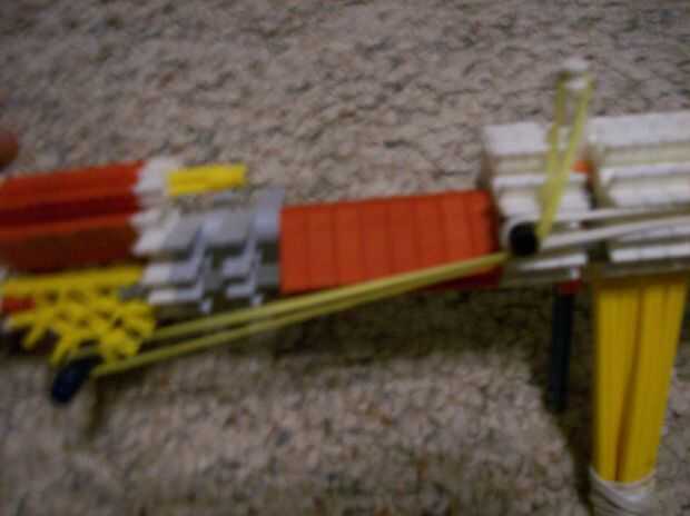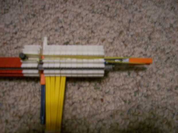 2. Coloque una banda elástica en el extremo de la barra blanca en el gatillo, rap alrededor de la pieza verde y engánchelo en la pieza azul por el centro de la pistola.