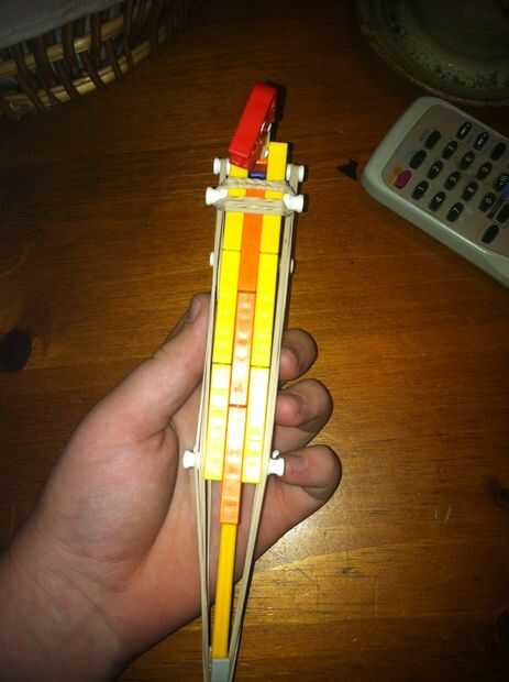 este es mi nuevo rifle de francotirador KVG tirachinas que hice me llevó cerca de una hora para hacer el arma todo pero valió la pena la pistola puede disparar cerca de 100 a 150 pies con tres o cuatro #64 bandas de goma y la munición una barra roja