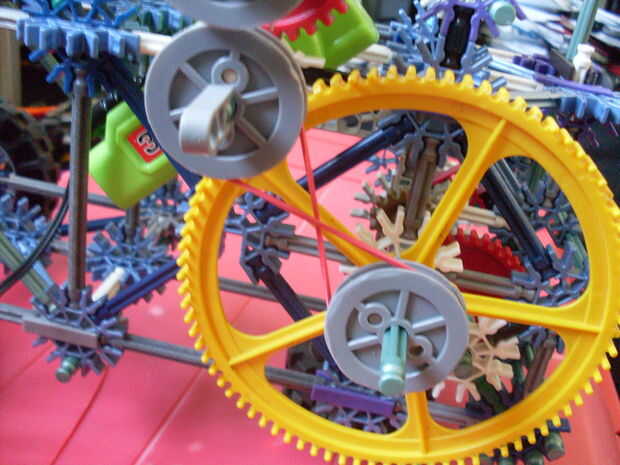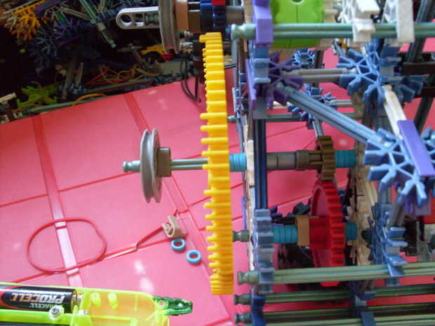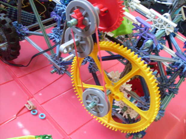 Foto 2: Esto es para el segundo período de cinco. Pase una banda elástica alrededor de las poleas tal como se muestra. Ahora, si enciende el motor, el eje de balancín debe desplazarse cada 5 segundos.