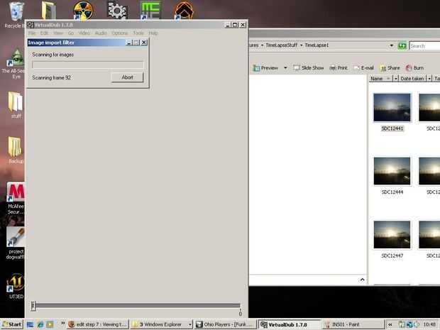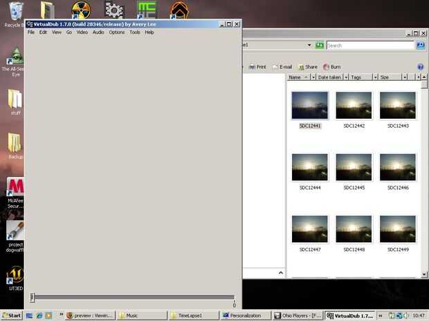 A veces esto puede ser hasta tu ordenador. Si no pones el tamaño de su foto hasta algo parecido a 1 megapixel, virtualdub tendrán dificultades para procesar todas las fotos de esas grandes rápidamente. También, si estás en un ordenador portátil como yo, asegúrese de que su tapado y el modo de alto rendimiento. Para el registro, mi sistema es: procesador de 2GHZ core 2 duo, 2GB de RAM y una tarjeta de gráficos de la 7900GS.