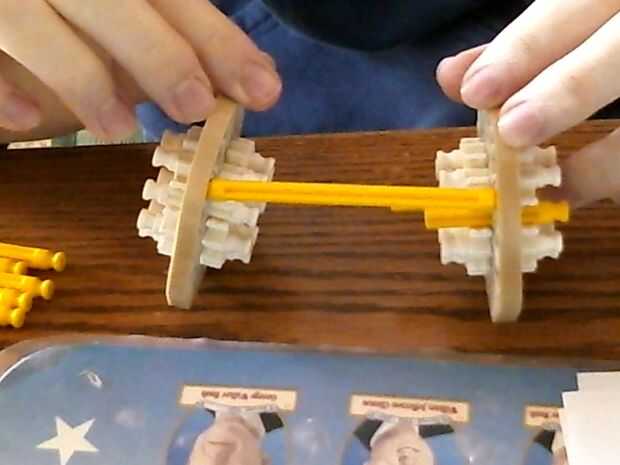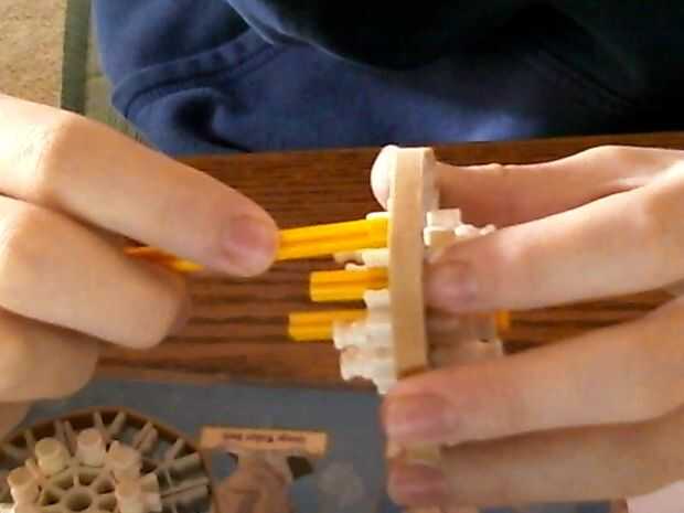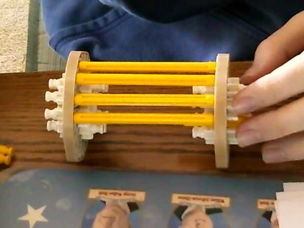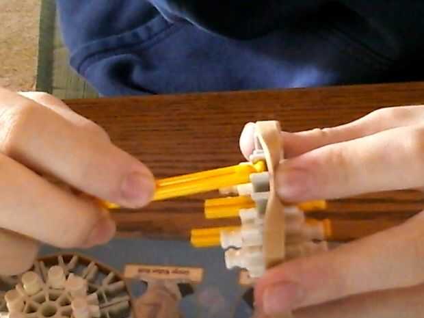 se necesita:Conectores:9 rojo8green8 amarillo2 blanco1 naranjaBarras:2 amarillo6 verdePaso 1: agregue dos conectores blancos agregar todas tus piezas hasta ahora en dos conectores blancosel Granada debe parecerse a la imagenPaso 2: Añadir la barra añ