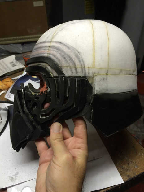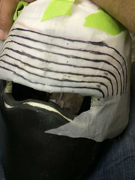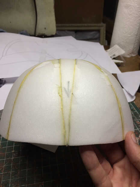 Cuando haya terminado, usted tendrá una media esfera. Esto puede estar bien para algunos cascos pero casco de Kylo Ren es más plano y cuadrado apagado en la parte superior. Había logrado mediante la reducción de la cúpula en medio, izquierda y derecha hemisferios y agregar 1" tira de espuma por el centro, estrechándose en la parte delantera y posterior. Haciendo así ensanchar y aplana el yop de la cúpula pero no cambia el ancho de la abertura de la bóveda. He añadido otra tira de 1" entre las mitades anterior y posterior para ampliar la forma de cúpula. Ello dio la cúpula de casco algunos más profundidad. • Ver diagrama de cúpula en las secciones de fotos.