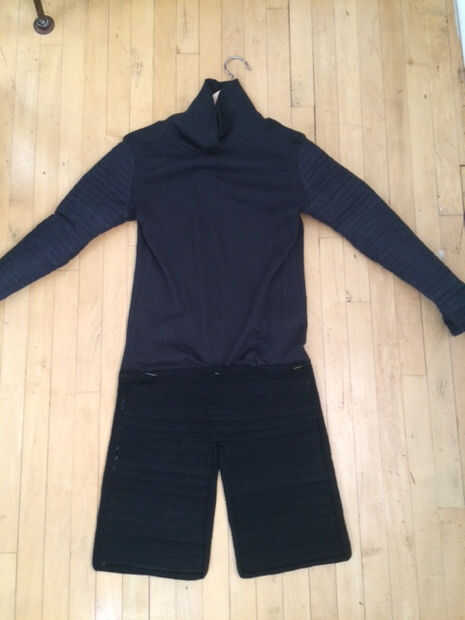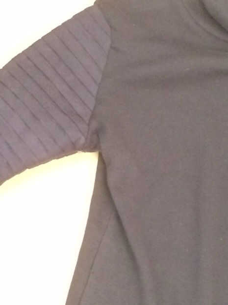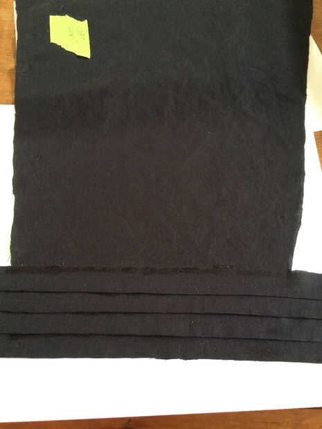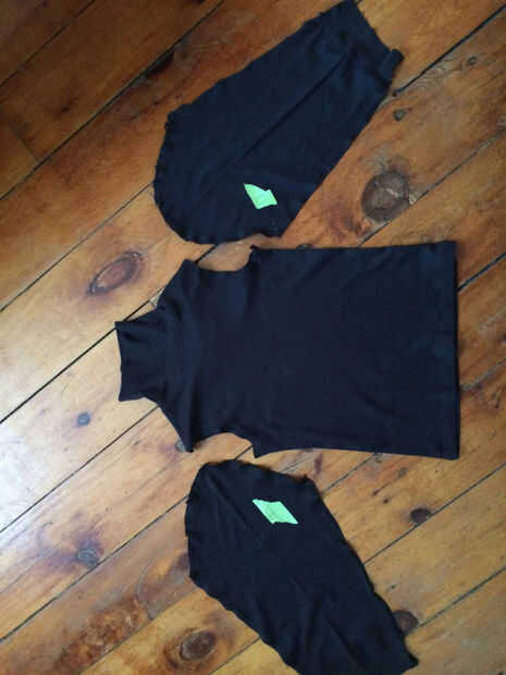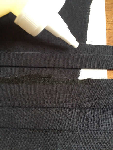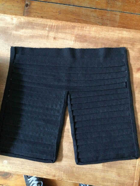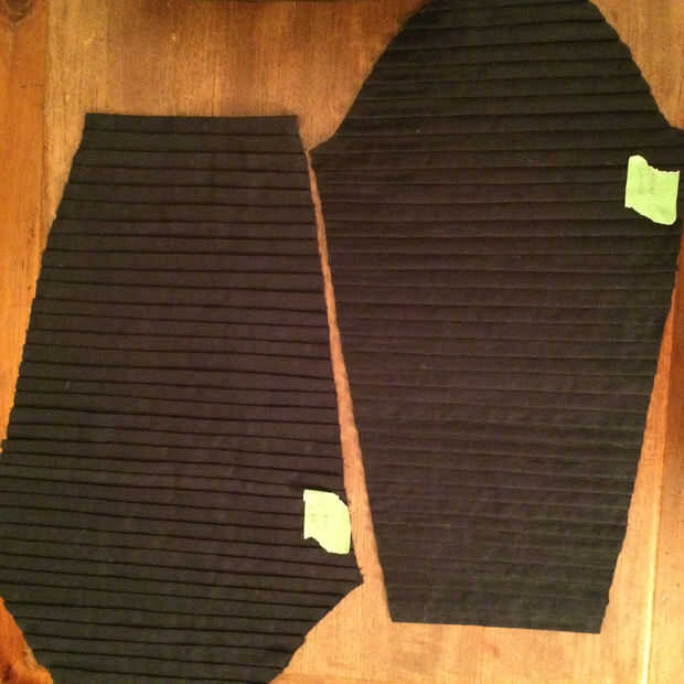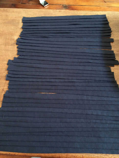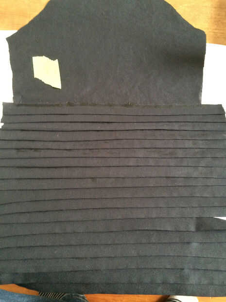 Empecé con un cuello de tortuga negra que mi hijo ya tenía y nunca había sido usado. Quité las mangas y trazado en la tela de algodón que iba a utilizar. Una vez creé una nuevo manga, calculé cuántos pliegues se necesita y cortar tiras de 1" de algodón. 37 en total para cada manga. Doblado sobre 1/4" de cada tira y planchada plana. Una vez terminado comencé a trazar sobre la manga y con pegamento para tela, había conectado cada tira a la base de algodón. Me aseguré que se superponen por lo que podía ocultar el pegamento cada vez que establecido un pliegue. Después se pega cada pliegue, había cortado las tiras al borde de mi manga de algodón incluyendo un margen de costura. Estos fueron puestos aparte para ser cosido más tarde.