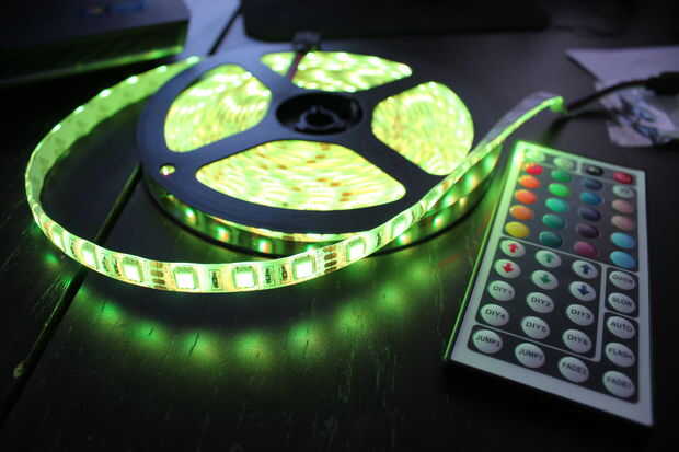 Estoy usando color cambiante rgb tiras, compradas en Amazon. Es un poco más de 16 pies de largo. Vienen con mandos a distancia para la programación se desvanece, secuencias de color, parpadeo y más.
