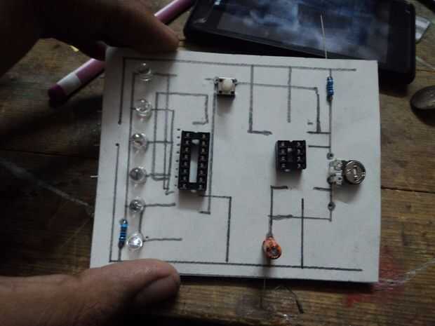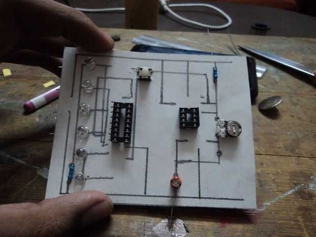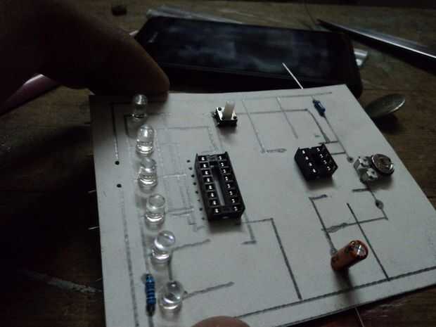 Insertar todos los componentes cuidadosamente comprobar los terminales de capacitor,L.E.D s y de resistencia variable de las dos clavijas que están alineadas en el mismo se unen en la misma línea y el tercer pin es el que representa la flecha. Doblar los pines para que no salgan mientras se suelda.