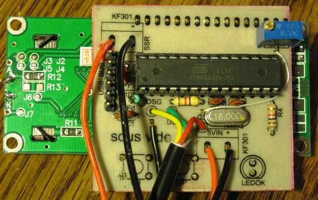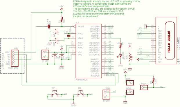 Se adjunta el esquema. U$ 2 es de 5V en de la fuente de alimentación USB. El potenciómetro de 10K ajusta el contraste en la LCD1602. El conector del relé va a la SSR25DA (la polaridad es importante) el DSx conexiones ir al sensor de temperatura DS18B20.
