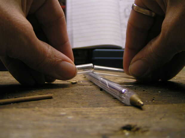 Atraviese el tubo de un bolígrafo, con la ranura directamente sobre el lápiz y pulsar en cualquier lado.