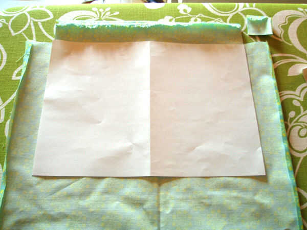 Colocar el papel en el bolso. Asegúrese de que hay la misma cantidad de tela en tres lados. Cortar las esquinas como se muestra en la imagen.