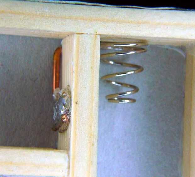 Cuando el marco es totalmente pegado es el momento de instalar los resortes y el LED. Los resortes están conectados a un homólogo plano para tres de los cuatro lados. De esta manera las baterías (AA, 1.5V) realmente se ponen en serie y producen un total de 6V. Más que suficiente para un solo LED de cualquier color. Cuatro es elegido por motivos simétricos y darle peso suficiente para producir un soporte estable.