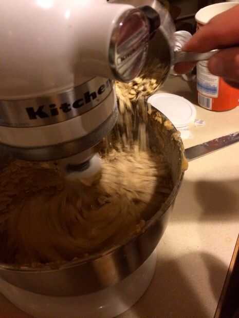 Agregar 2 1/4 tazas de harina y 2 2/3 tazas de avena mientras se está mezclando.