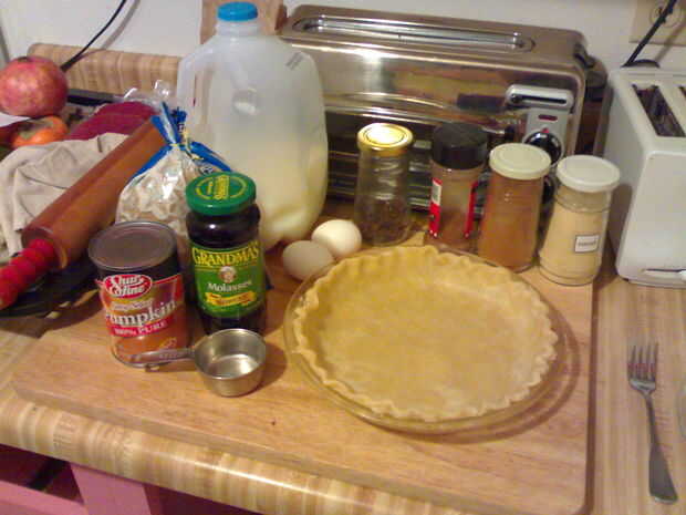 Suavizar los huevos y el azúcar. Agregar especias y miel de caña. Agregue el zapallo y la leche.