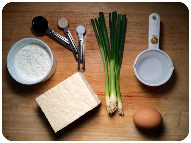 1 paquete de Tofu (14oz) de la firma 1 huevo 3 tallos de cebolla de verdeo 3 cucharadas de salsa de soja 1 cucharada de azúcar 1 cucharadita de sal 1/2 taza de agua 1/2 taza de aceite vegetal 1/2 taza de almidón de maíz