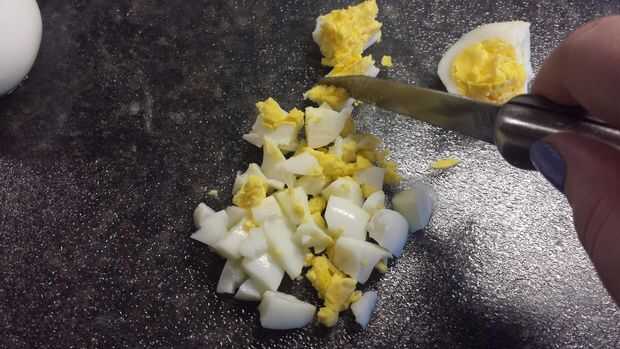 Pelar los huevos y cortar en tamaño preferido. Esto puede hacerse tan grueso o tan fino como se prefiera.