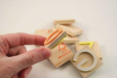 reuní las pegatinas de espuma adhesiva a las pequeñas plazas. Desde que tuve un frasco entero de cartas, puse la letra en el frente y la espalda. Hay sólo unas pocas letras que no son simétricas de alguna manera y así que tuve que pegar hacia atrás en el lado estampado en su lugar. También tenía que trabajar con el pegamento un poco para que no ensucie con la tinta de estampación.