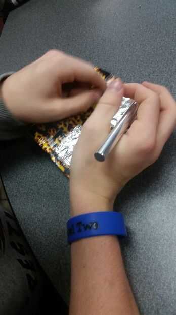 Use un cuchillo del Exacto o tijeras (cuchilla Exacto recomendado) para cortar dos ranuras largas en la parte superior de la caja. Los rectángulos deben ser sólo lo suficientemente amplio como para hojas de papel aluminio para pasar por la parte superior de la caja y doble en el interior. Ahora, inserte el papel de aluminio. A continuación, cortar dos pequeños agujeros justo por encima de las aberturas que usted acaba de hacer. Estos agujeros serán sólo lo suficientemente grandes como para que una pinza quepa cómodamente. Por último, corte un pequeño agujero en la parte posterior. Esto es para el cable se conecta al makey makey en un lado y el ordenador en el otro.