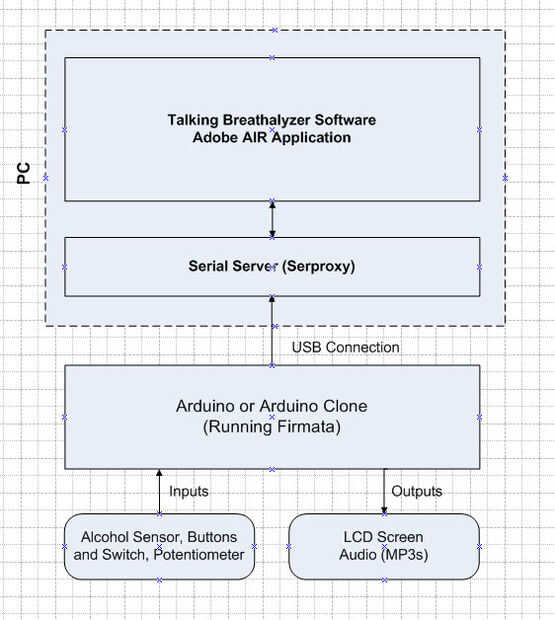 La aplicación de PC que la alcoholemia que habla se escribe en acción Script 3.0 del Flash del Adobe. El siguiente diagrama muestra cómo funciona: escucha de software del PC para los datos provenientes de la Arduino a través de un servidor en serie (serproxy.exe) que es un fondo de procesos corriendo en el PC.